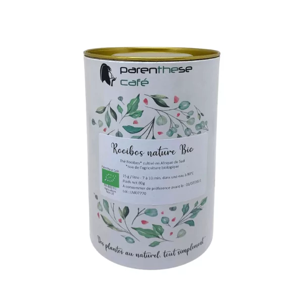 Le rooibos nature bio est une infusion originaire d’Afrique du Sud, issue de la plante Aspalathus linearis. Naturellement sans théine, il est apprécié pour sa douceur, sa rondeur en bouche et son absence d’amertume. Chez Parenthèse Café, il est proposé dans une version biologique soigneusement sélectionnée, afin de garantir une infusion à la fois simple, saine et fidèle à ses origines.