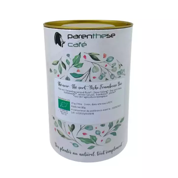 Le thé noir – thé vert pêche framboise bio de Parenthèse Café est une création unique qui marie subtilement intensité, fraîcheur et gourmandise. Ce mélange original associe trois grands crus de thé – Darjeeling, Oolong et Gunpowder – à de véritables morceaux de fruits pour offrir une infusion équilibrée et raffinée. Issu de l’agriculture biologique certifiée, ce thé garantit une qualité irréprochable et une traçabilité complète, répondant aux attentes des amateurs exigeants.